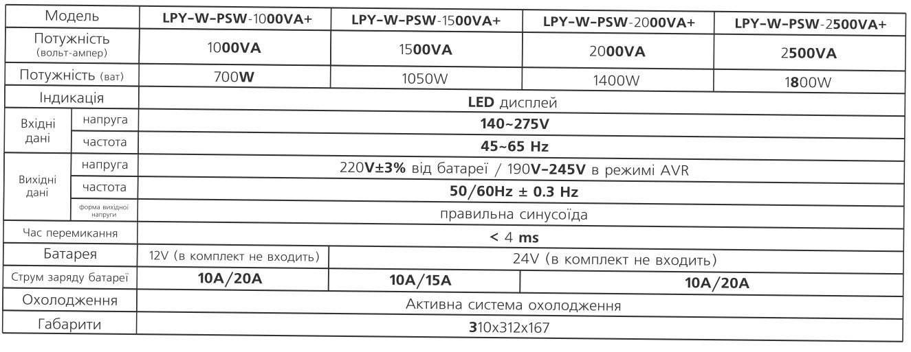 Технические характеристики: ИБП LogicPower (Лоджик Повер) с правильной синусоидой 24V LPY-W-PSW-2500VA+(1800Вт)10A/20A