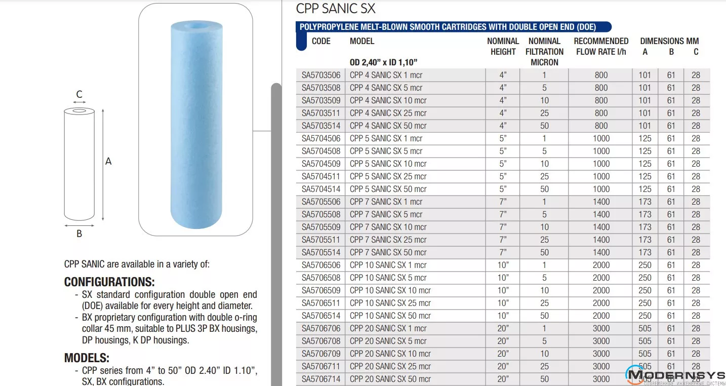 Технические характеристики: Картридж Atlas Filtri (Атлас Фильтры) антимикробный из вспененного полипропа. CPP SANIC 10" SX 5 мкр 45°C