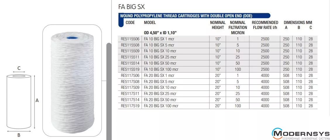 Технические характеристики: Картридж Atlas Filtri (Атлас Фильтры) из полипропиленовой нити FA BIG 10" SX 25 mcr