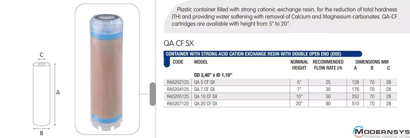 ATLAS filtri QA 10-CF SX-TS картридж для умягчения воды (удаления солей жесткости). Умягчающий картридж ATLAS filtri QA 10-CF SX-TS контейнерного типа с засыпкой из Na+ катионитной ионообменной смолы. Применяется для умягчения воды (удаление солей жесткости). Подходит ко всем стандартным 10" магистральным фильтрам, а также системам обратного осмоса и системам проточной фильтрации.