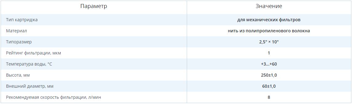 Технические характеристики для картриджа из полипропиленовой нити Ecosoft