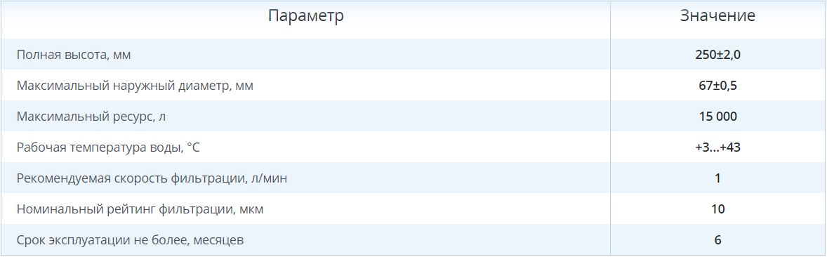 Технические характеристики для картриджа из прессованного активированного угля Ecosoft