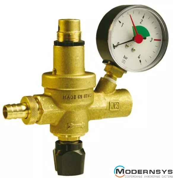 Арматура служит для наполнения и подпитки отопительных систем теплоносителем. В состав изделия входит редуктор давления, запорный и обратный клапаны. Для изготовления корпуса использована латунь. Давления на входном штуцере может составлять 6-10 Бар, а выходное давление можно устанавливать в пределах 0,5-3 Бар.