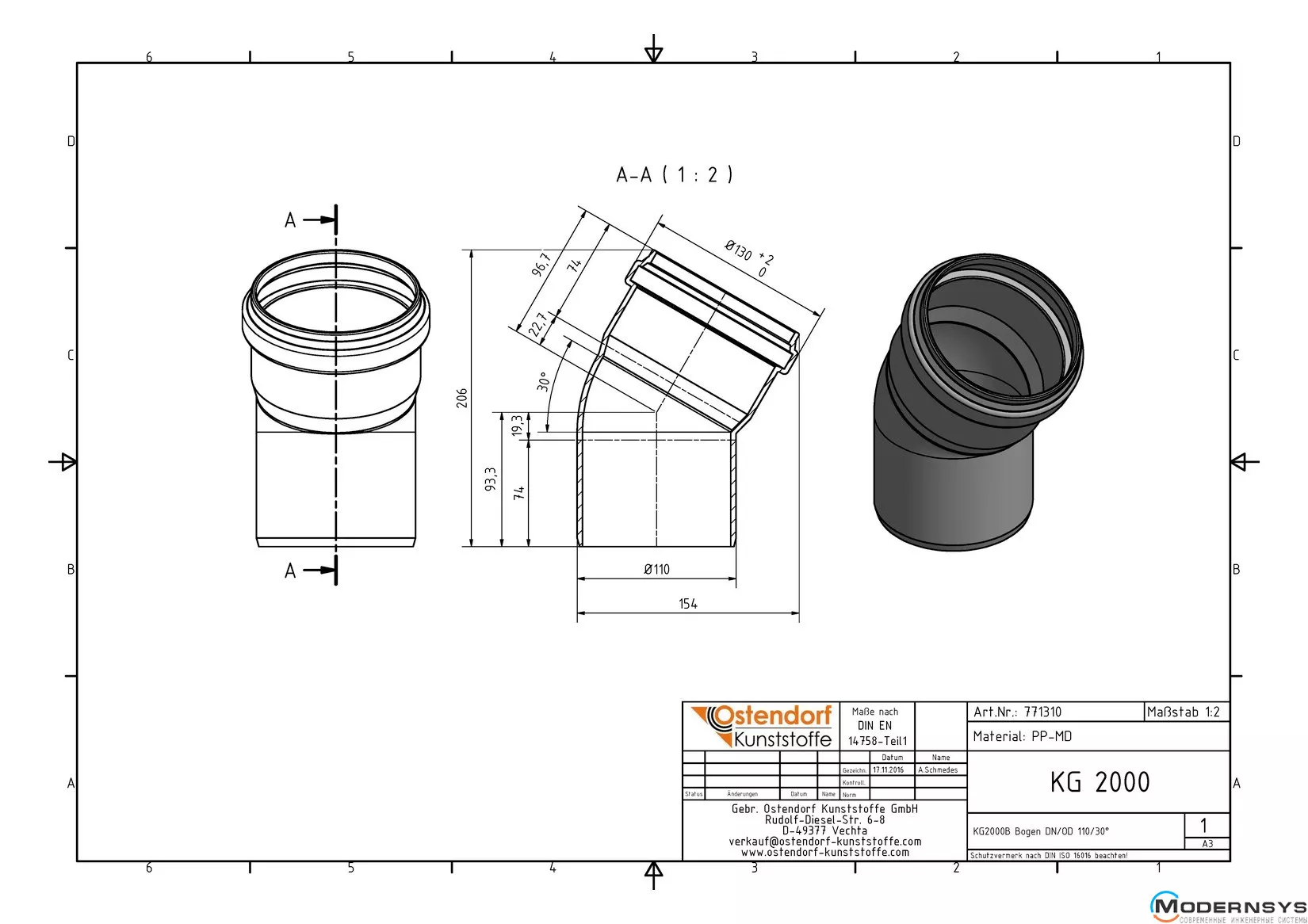 Технические характеристики: Колено канализационное Ostendorf (Остендорф) KG2000B 100х30°