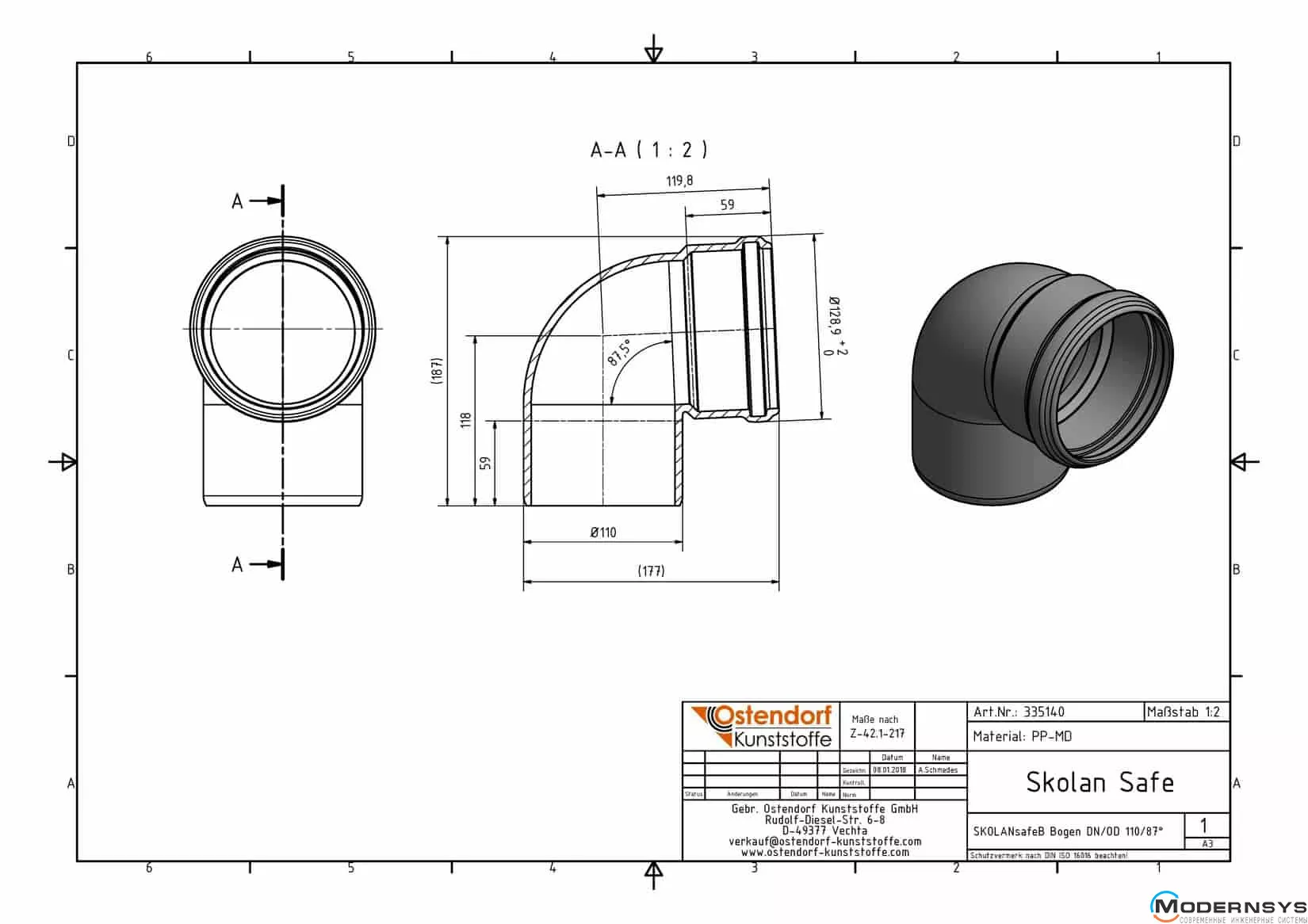 Описание: Колено канализационное Ostendorf (Остендорф) Skolan db 100х87 (335140)