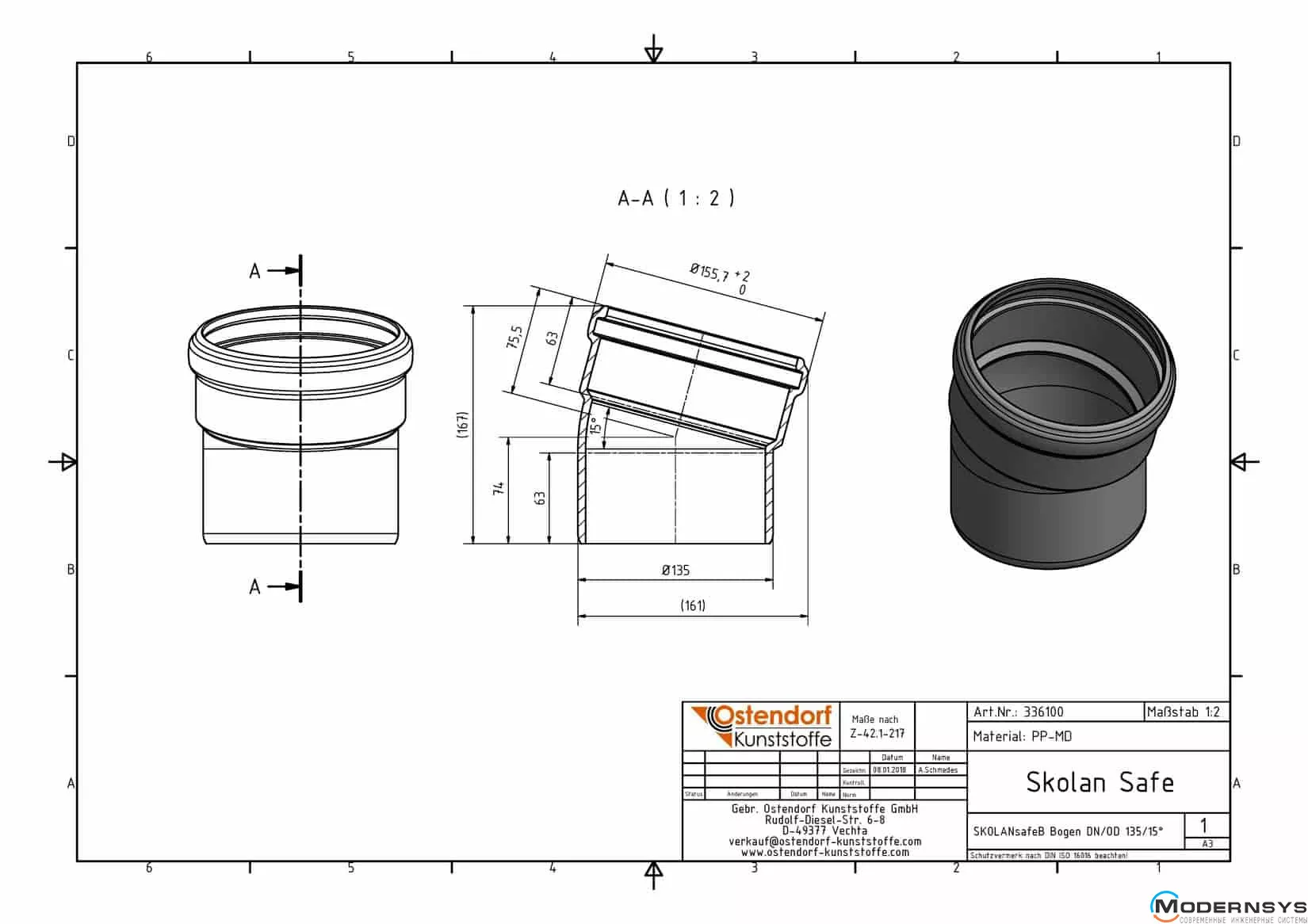 Технические характеристики: Колено канализационное Ostendorf (Остендорф) Skolan db 125х15 (336100)