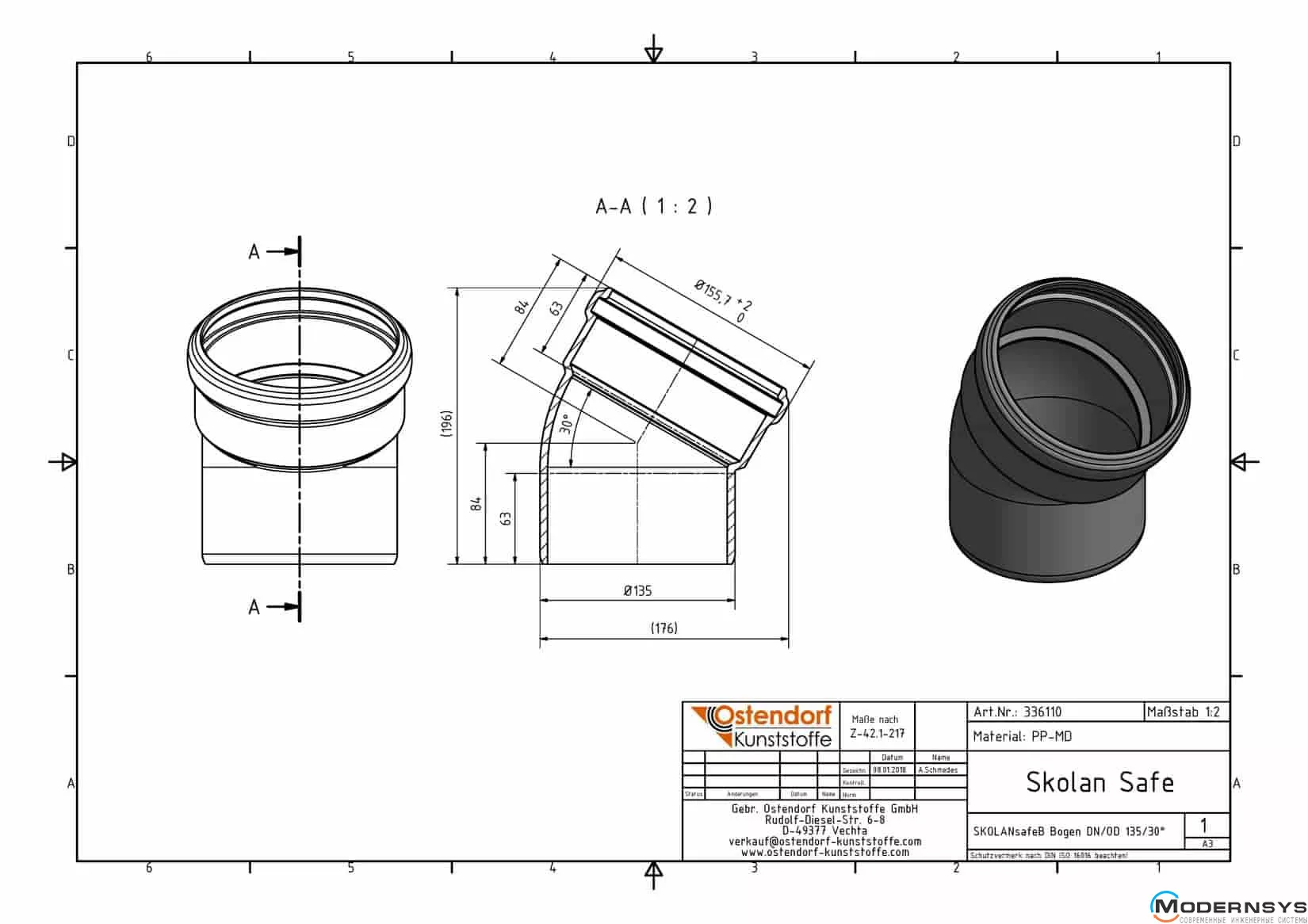 Технические характеристики: Колено канализационное Ostendorf (Остендорф) Skolan db 125х30 (336110)