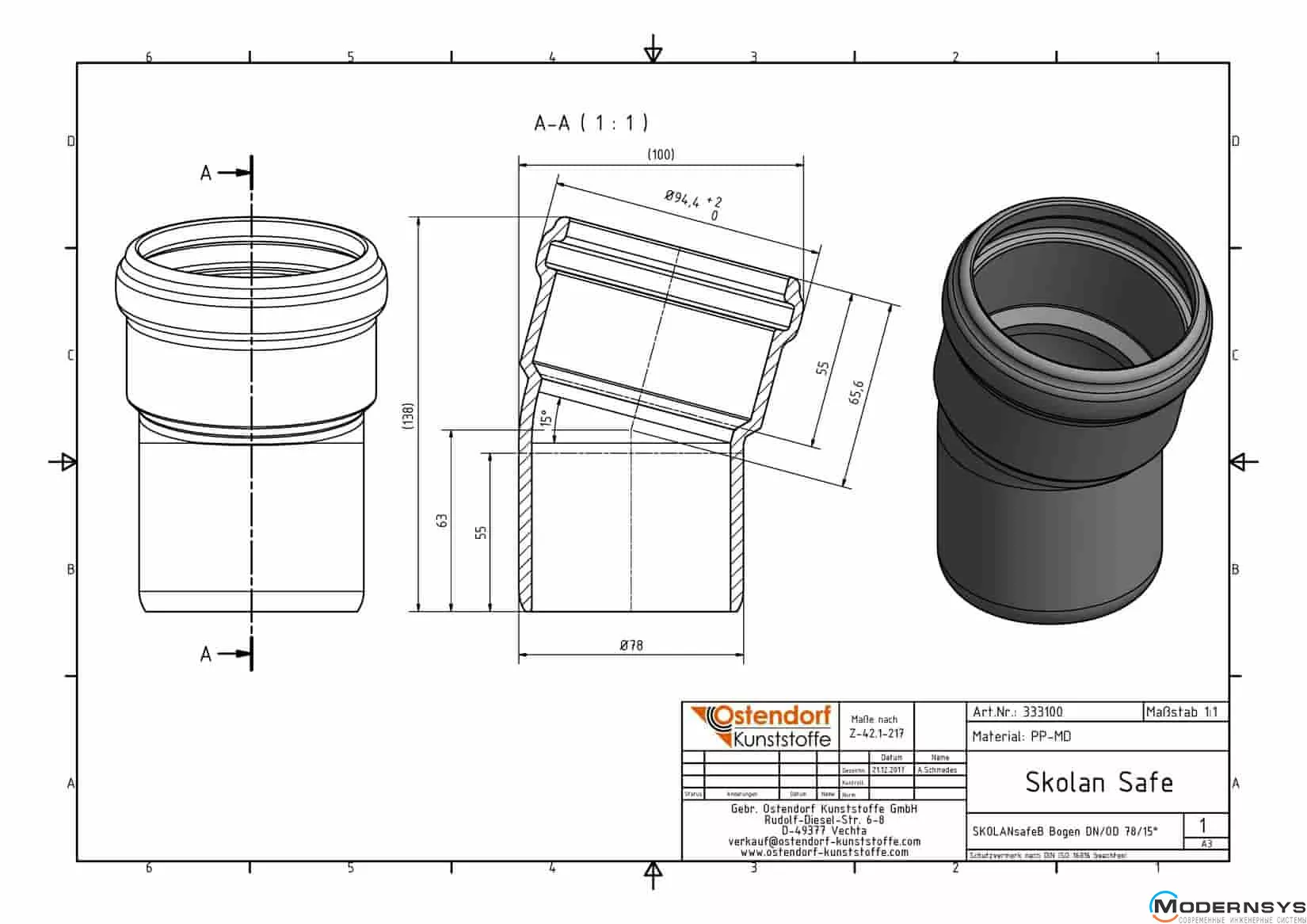Технические характеристики: Колено канализационное Ostendorf (Остендорф) Skolan db 70х15 (333100)