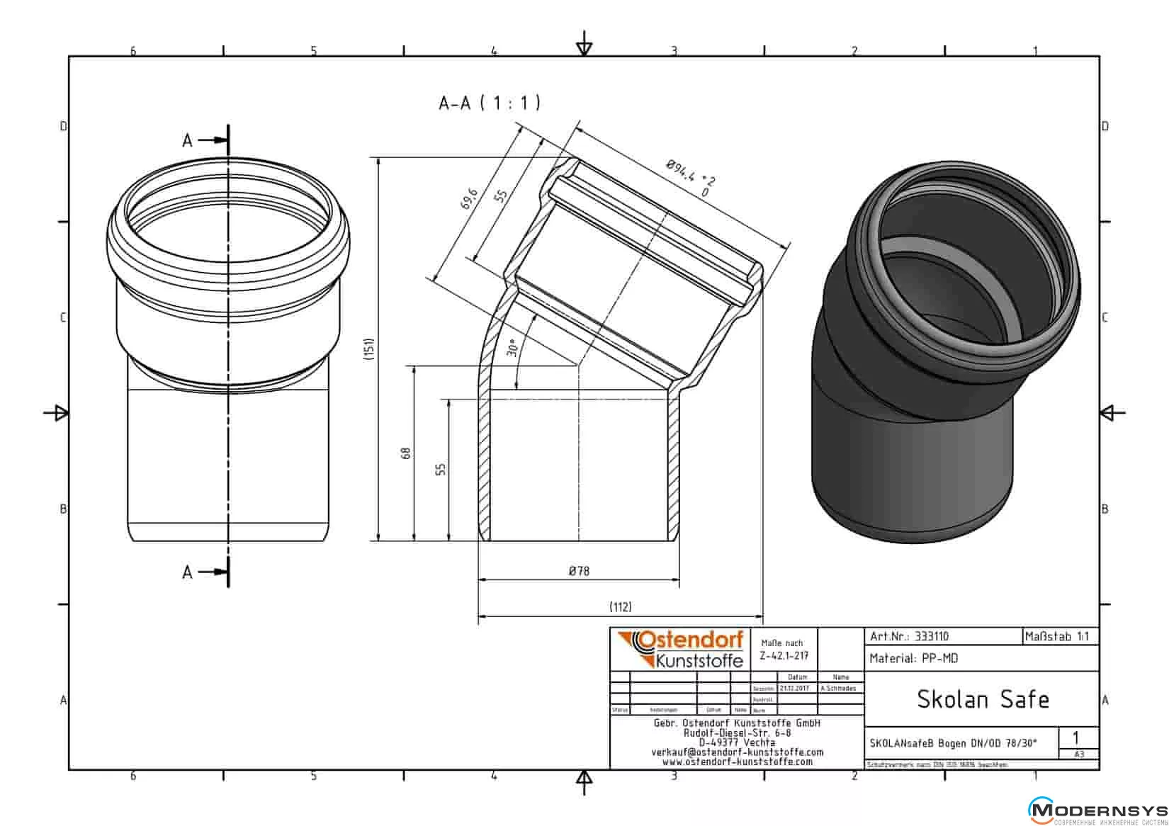 Технические характеристики: Колено канализационное Ostendorf (Остендорф) Skolan db 70х30 (333110)