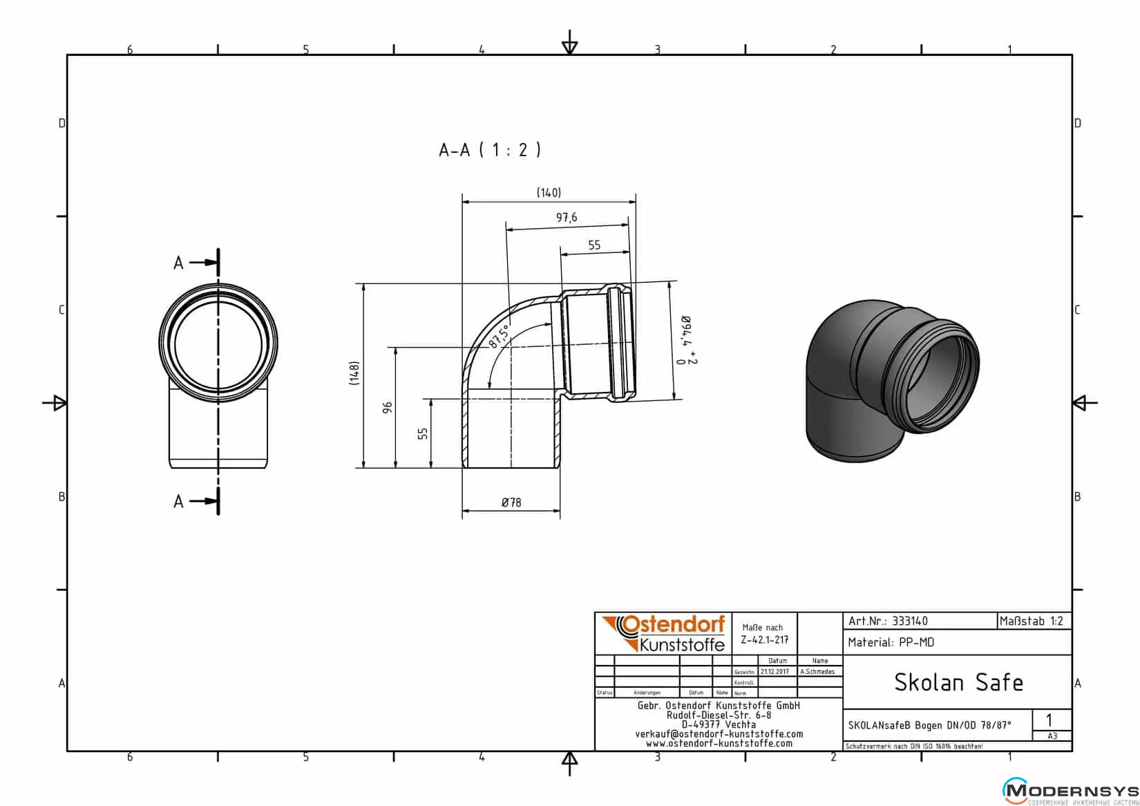 Описание: Колено канализационное Ostendorf (Остендорф) Skolan db 70х87 (333140)