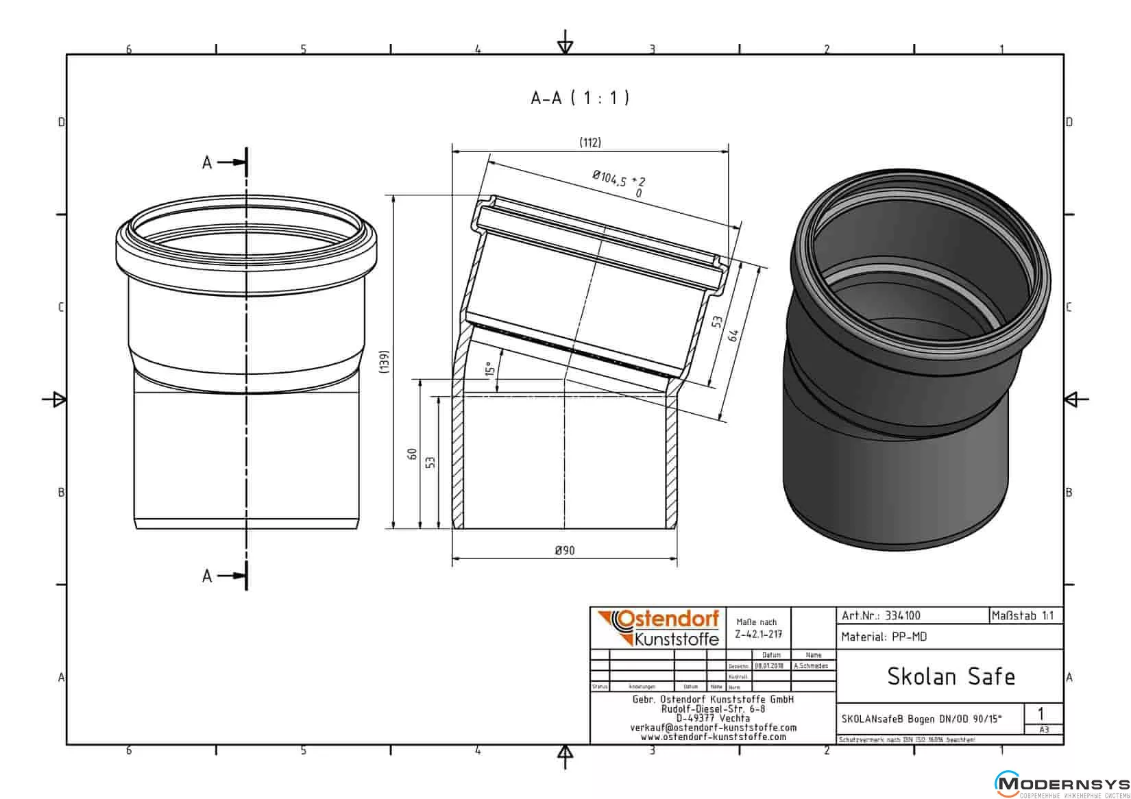 Технические характеристики: Колено канализационное Ostendorf (Остендорф) Skolan db 90х15 (334100)