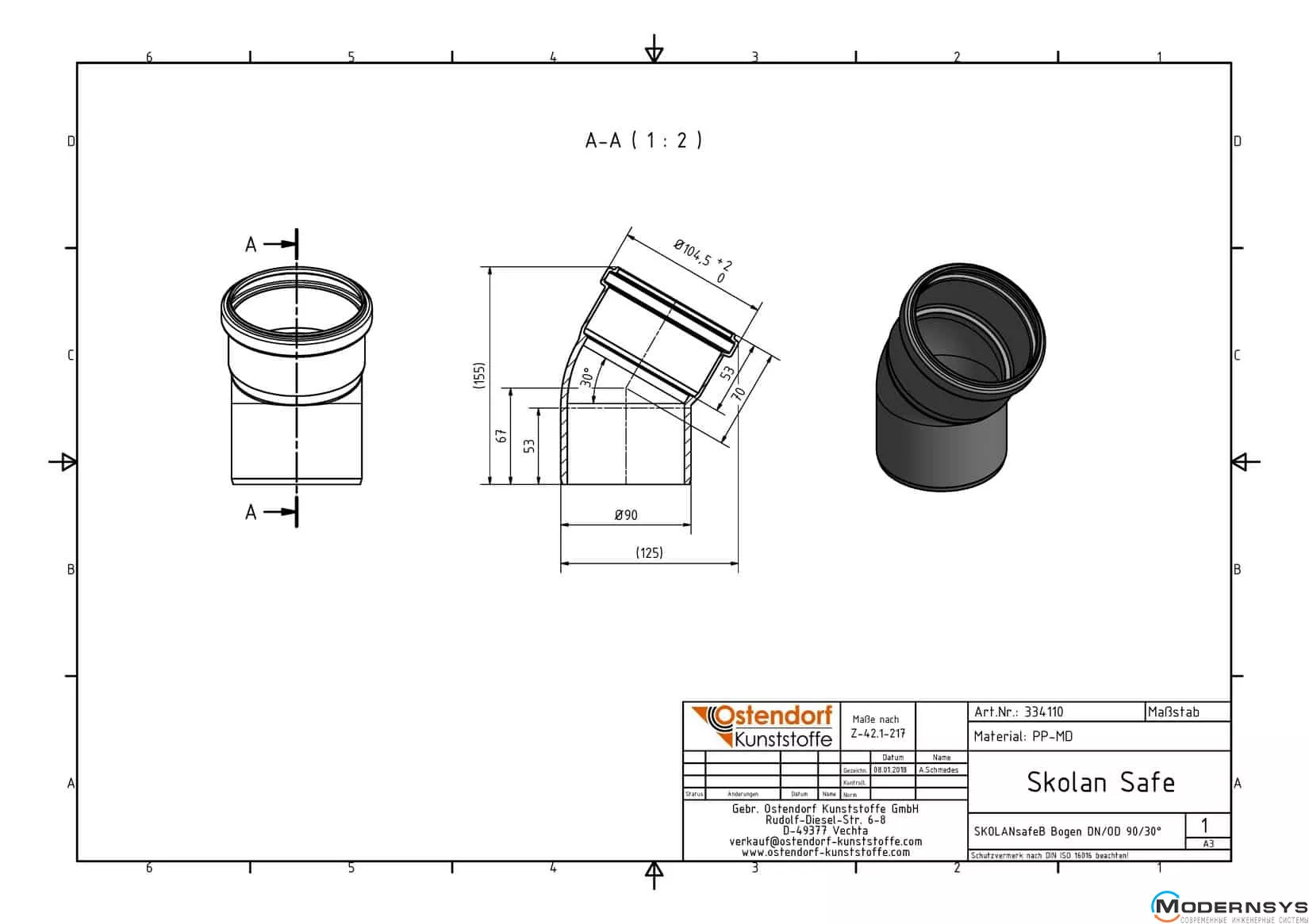 Технические характеристики: Колено канализационное Ostendorf (Остендорф) Skolan db 90х30 (334110)