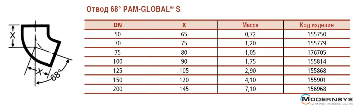Технические характеристики: Колено Pam-GLOBAL (Пам-Глобал) S 100x68 гр.