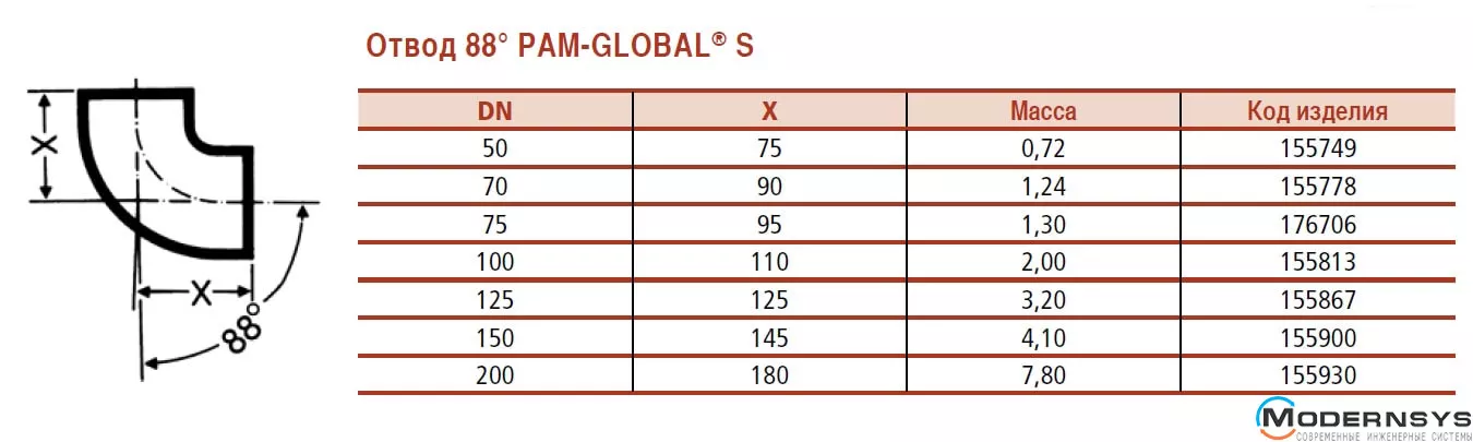 Технические характеристики: Колено Pam-GLOBAL (Пам-Глобал) S 150x88 гр.