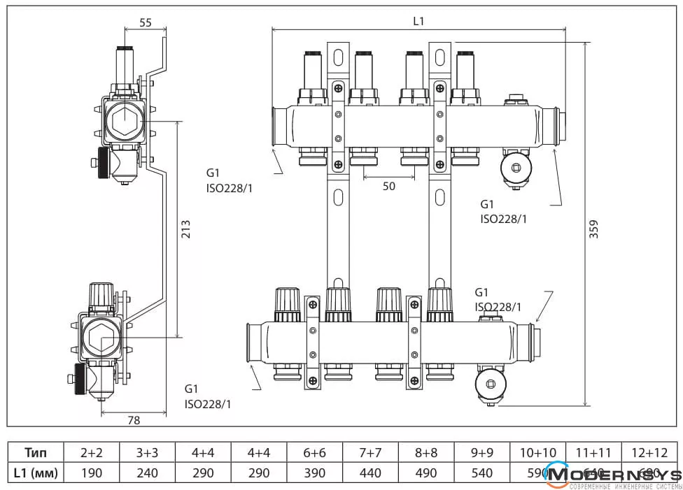 Подающий коллектор не укомплектован ротаметрами и оборудован ручным воздухоотводчиком с дренажным краном.