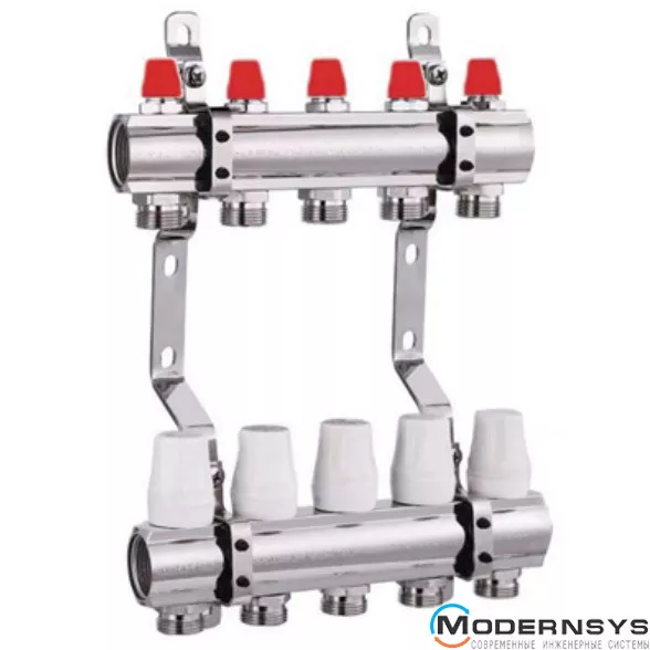 Розподільний нікельований колектор у зборі 1” - відводи ¾” Євроконус. Складається з: ручних вентилів з ковпачком, на яких можуть встановлюватися електротермічні головки, регулювального клапана з подвійним регулюванням, кріплення. Міжосьова відстань відводів 50 мм (подача та обратка)