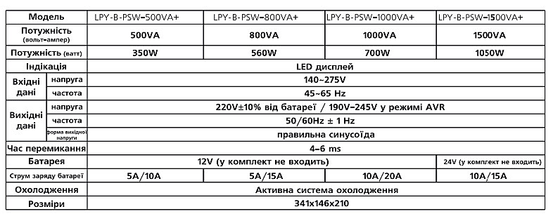 ИБП LPY- B - PSW-800VA+ в черном металлическом корпусе имеет следующие технические характеристики: