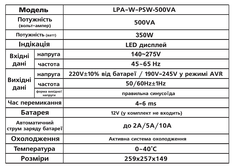 ИБП LPY-PSW-500VA+ в металлическом корпусе имеет следующие технические характеристики: