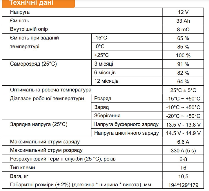 - Емкость батареи – 33 ампер/часов.