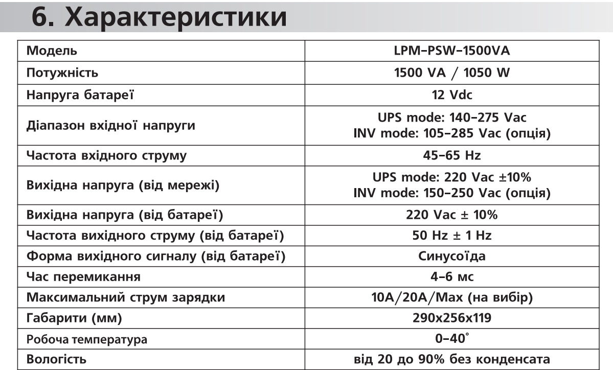 Источник бесперебойного питания с правильной синусоидой мощностью 1500/1050 VA/W выполняет 2 основные функции: стабилизация напряжения (на входе - 140-275, на выходе - 220±10%V) и преобразование постоянного тока от аккумулятора в источник переменного напряжения 220V. UPS системы бесперебойного питания управляется микропроцессором. Аккумуляторная батарея обеспечивает подачу электроэнергии в режиме резервного питания.