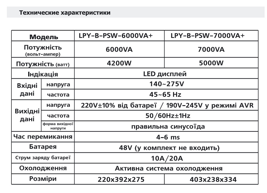 ИБП LPY-B-PSW-6000VA+ (4200Вт) 10A/20A имеет следующие технические характеристики: