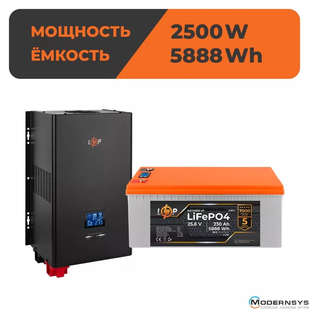 Комплект резервного питания LogicPower ИБП с правильной синусоидой 24V LPE-W-PSW-3600VA+ (2500Вт) 1-50A + Аккумулятор LP LiFePO4 LCD 24V (25,6V) - 230 Ah (5888Wh) (BMS 200A/100A) пластик разработан и введен в эксплуатацию для обеспечения бесперебойного питания электрических газовых котлов, систем видеонаблюдения, компьютерной техники и других устройств, которые работают в режиме 24/7/365. Комплект может быть использован, как источник бесперебойного питания для бомбоубежища.
