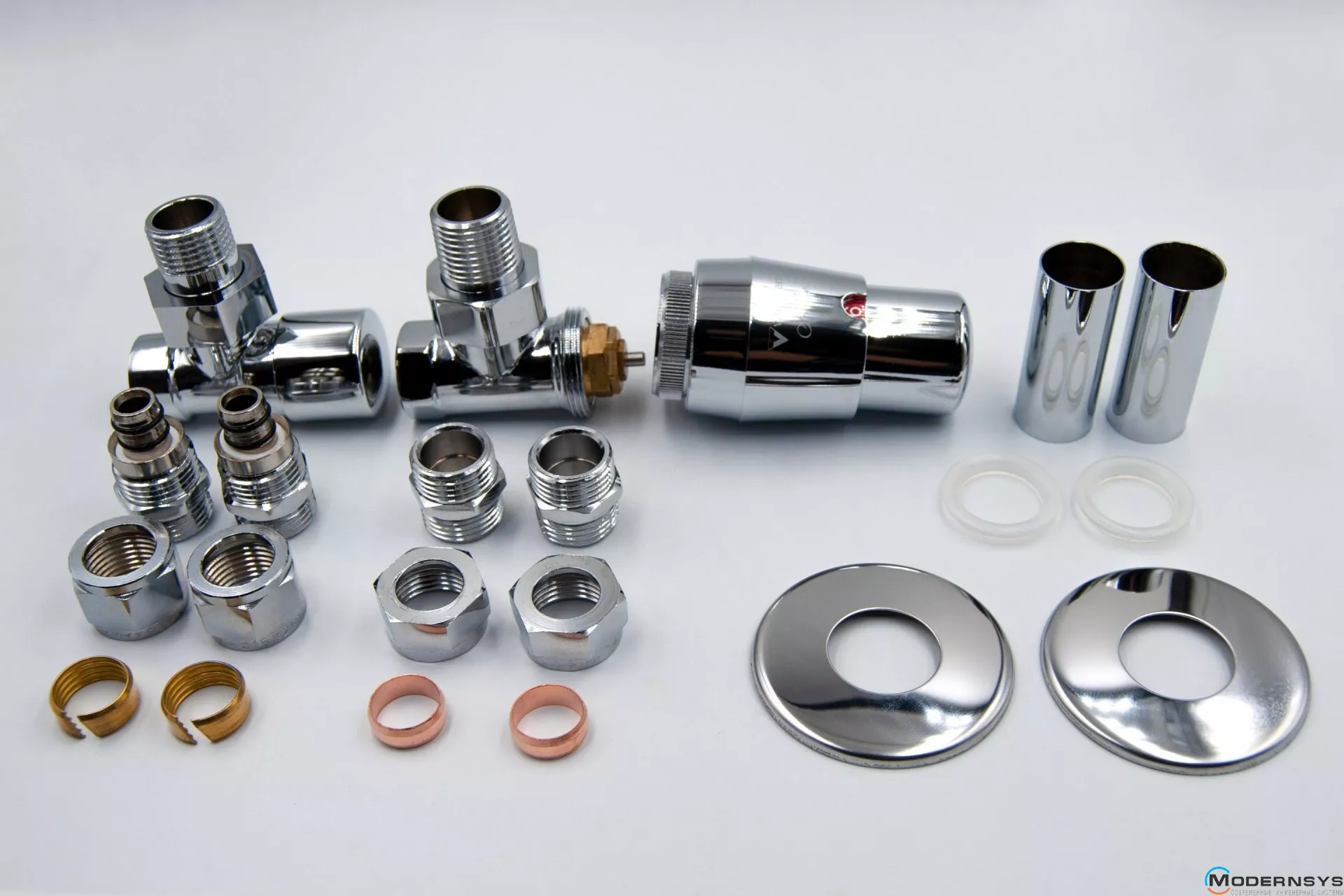 Комплект термостатический Vario Term, ROYAL, All In One, угловой предназначен для отопительных приборов с боковым подключением к трубопроводам системы отопления. Есть возможность выбора фитингов на PEX или Cu: