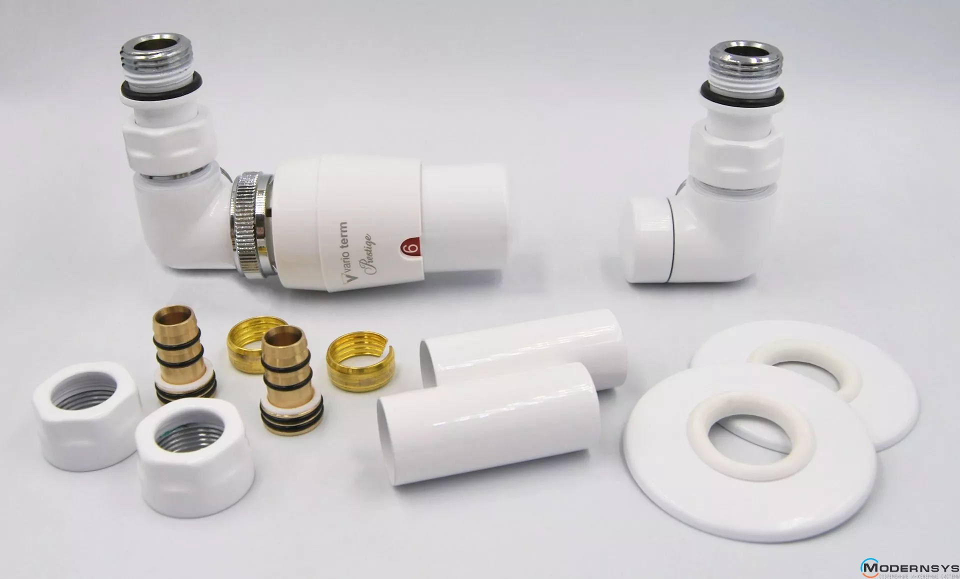 - термостатический клапан Vision, запорный клапан Vision, термостатическая головка Prestige, одинарная маскировочная розетка -2 шт. маскировочная втулка - 2 шт., адаптер/фитинг переход на Cu/PEX - 2 шт.