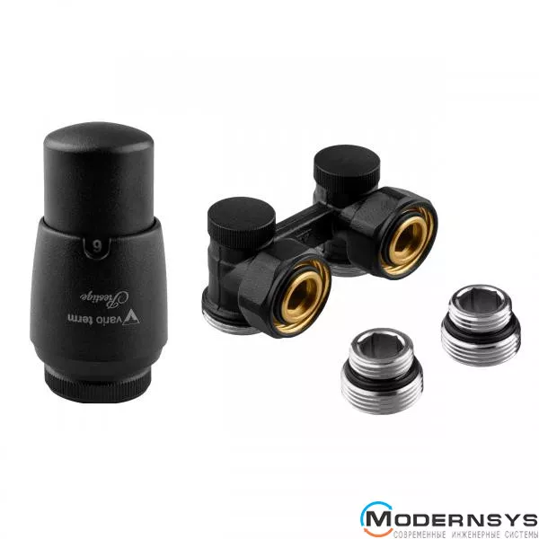 Угловой комплект для нижнего подключения радиатора Vario Term Typ V Black matt. Представленный комплект устанавливается в системах центрального отопления и разрешает индивидуальное отключение радиатора для замены или обслуживания без воздействия на другие отопительные приборы в системе. В основном применяются для стальных радиаторов с нижним подключением, где расстояние между патрубками (между осью) составляет 50 мм.