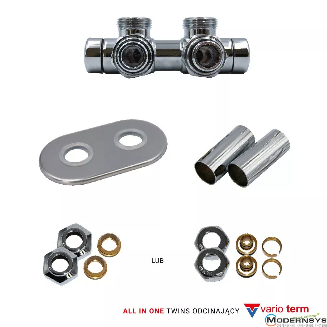 Запорный клапан Vario Term, 50 мм, TWINS, All In One, предназначенный для отопительных приборов, полотенцесушителей с нижним подключением к трубопроводам системы отопления. Расстояние между подключениями 50 мм. Есть возможность выбора фитингов на PEX или Cu: