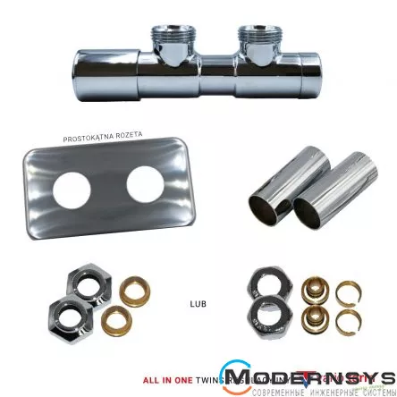 - ручное регулировочное соединение угловое Twins, редукционные ниппели двойная маскировочная розетка, маскировочная втулка - 2 шт., адаптер / фитинг переход на Cu/PEX - 2 шт.