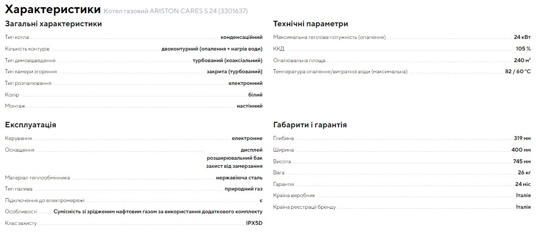 Технические характеристики: Конденсационный котел Ariston (Аристон) CARES S 24