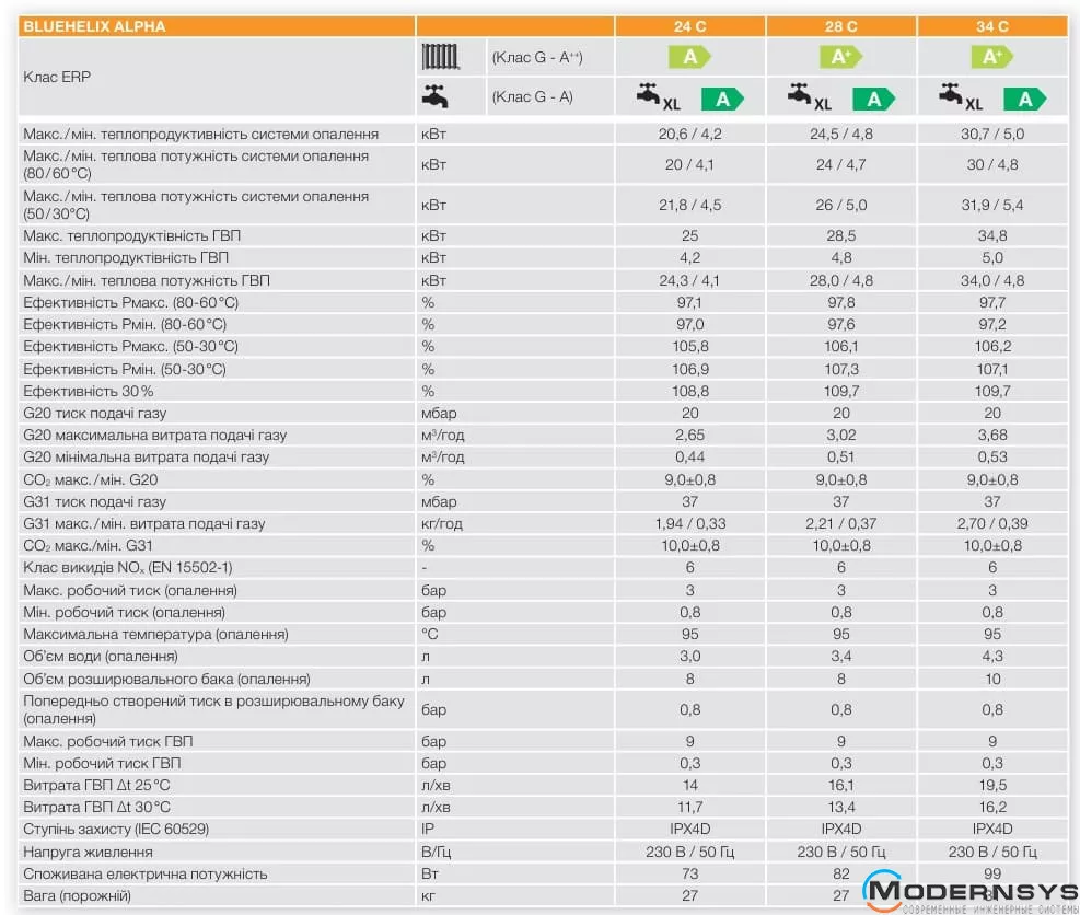 - коэффициент модуляции (плавное изменение мощности) для моделей 24/28 кВт – 1:6; 34 кВт – 1:7;