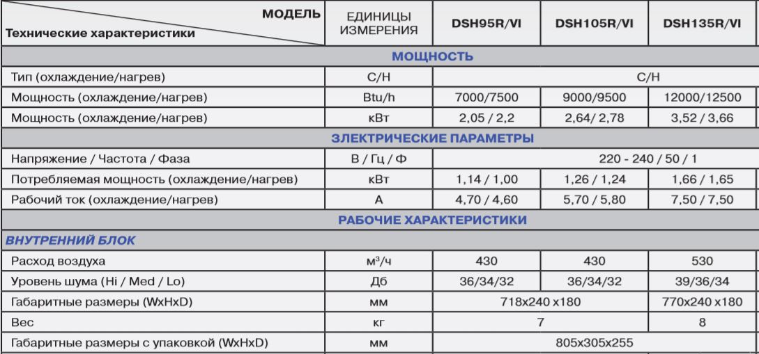 Технические характеристики для серии кондиционеров Dekker DSHR/VI