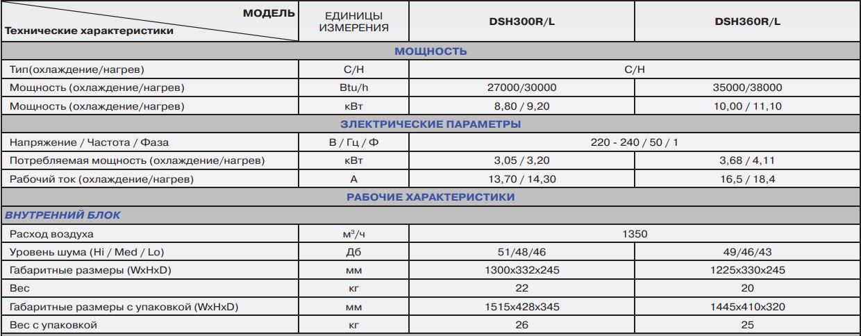 Технические характеристики для серии кондиционеров Dekker DSHR/L