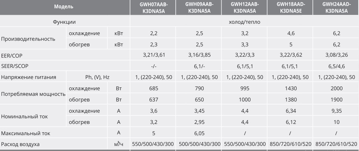 Технические характеристики для серии кондиционеров Gree GWHAA-K3DNA5