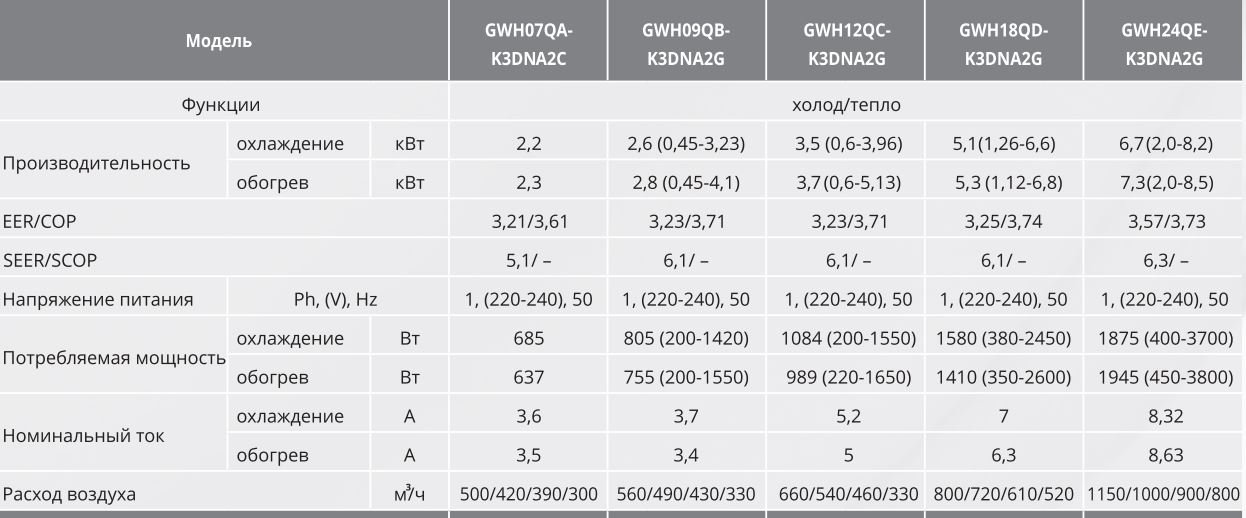 Технические характеристики для серии кондиционеров Gree GWHQ-K3DNA2