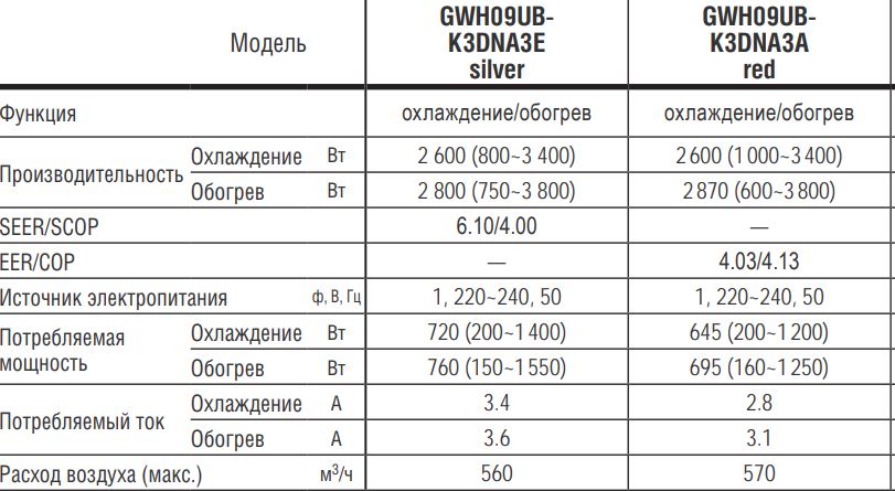 Технические характеристики для серии кондиционеров Gree U-POEM