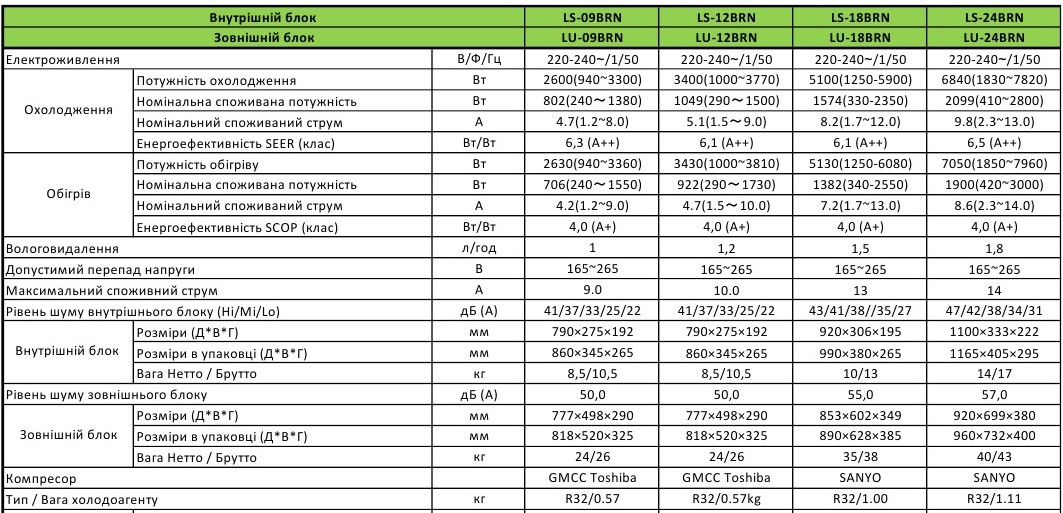 Технические характеристики: Кондиционер Leberg (Леберг) LS-12BRN / LU-12BRN