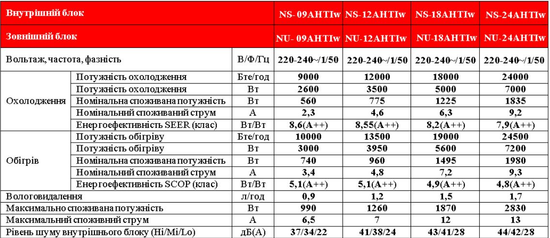 Технические характеристики для серии кондиционеров Neoclima NS/NU-AHTIw
