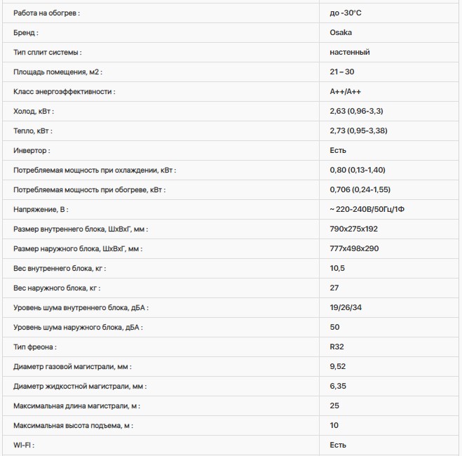Технические характеристики: Кондиционер Osaka (Осака) Aura DC Inverter STA-09HW (Wi-Fi)