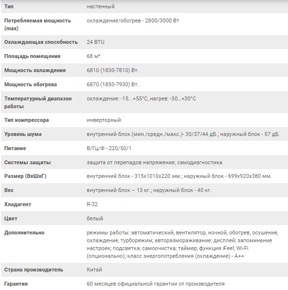 Технические характеристики: Кондиционер Osaka (Осака) Aura DC Inverter STA-24HW (Wi-Fi)