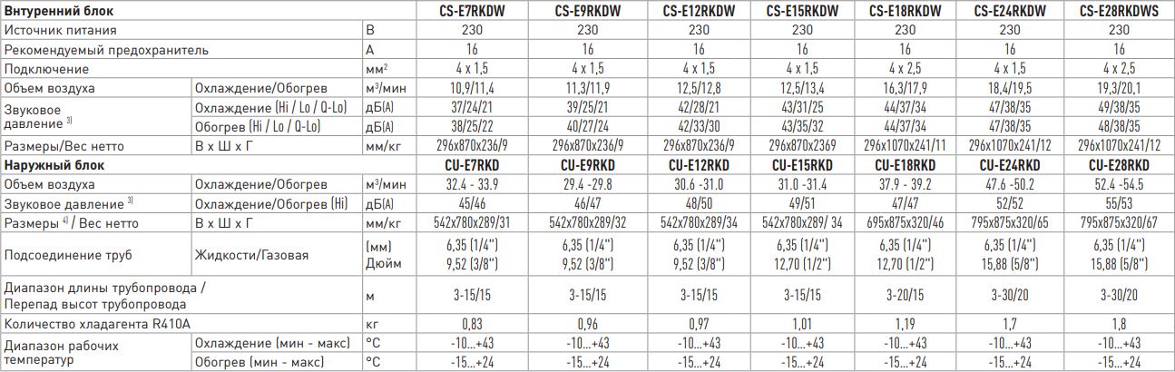 Технические характеристики для серии кондиционеров Panasonic CS/CU-ERKD