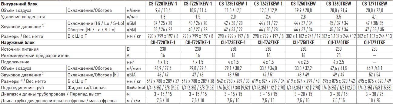 Технические характеристики для серии кондиционеров Panasonic CS/CU-TZTKEW-1