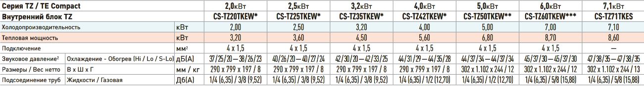 Технические характеристики для серии кондиционеров Panasonic CS/CU-TZTKEW
