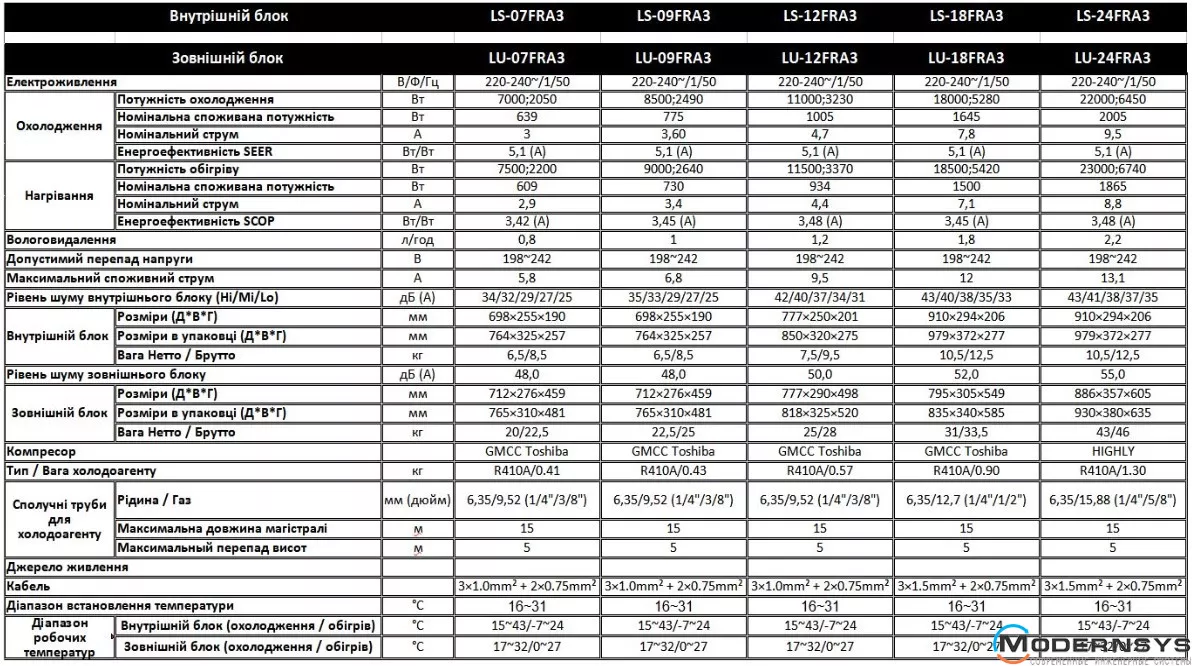 Технические характеристики: Кондиционер сплит-система Leberg (Леберг) On/Off FREYA 3.0 LS-12FRA3/LU-12FRA3