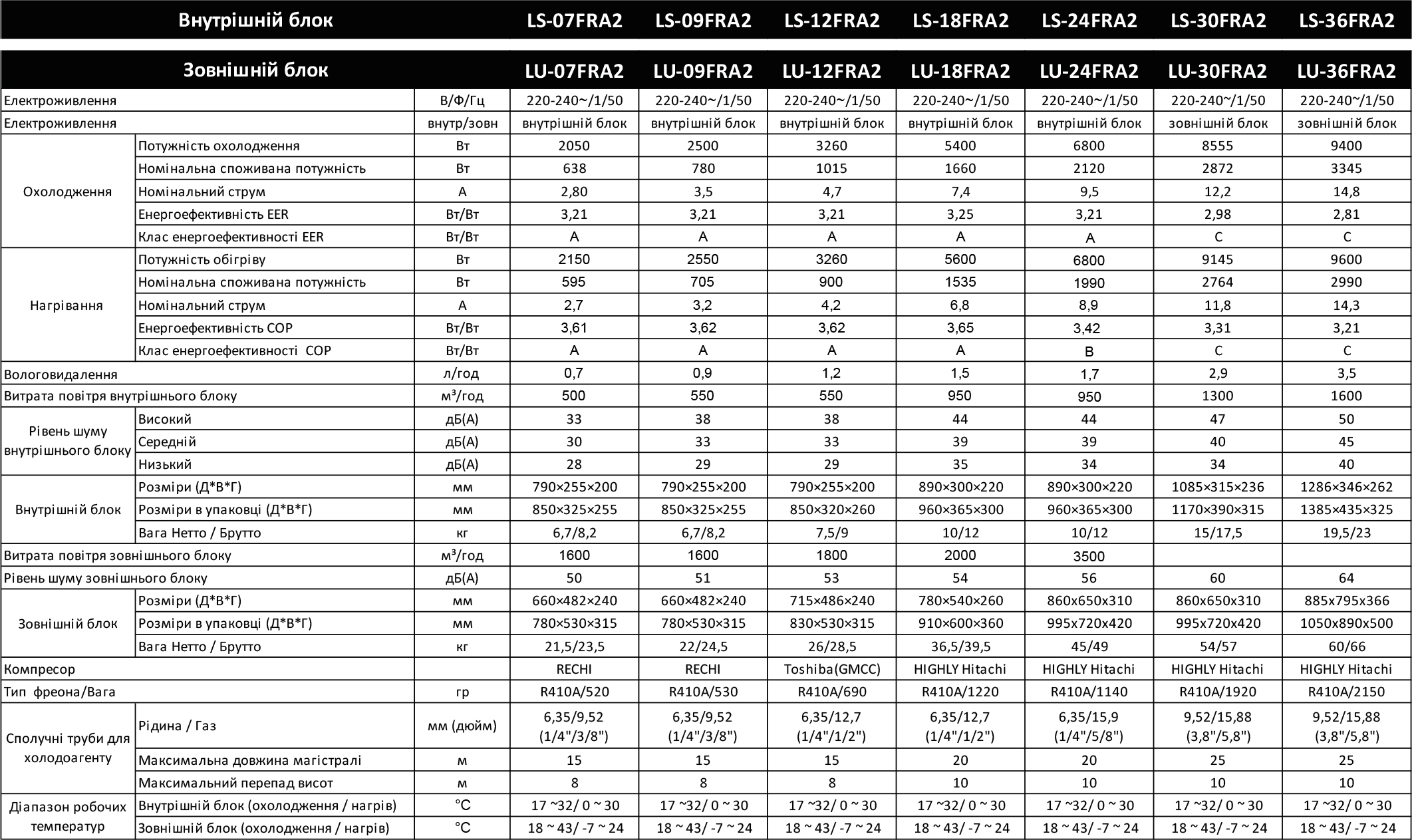 Технические характеристики: Кондиционер Leberg (Леберг) LBS-FRA36UA2/LBU-FRA36UA2