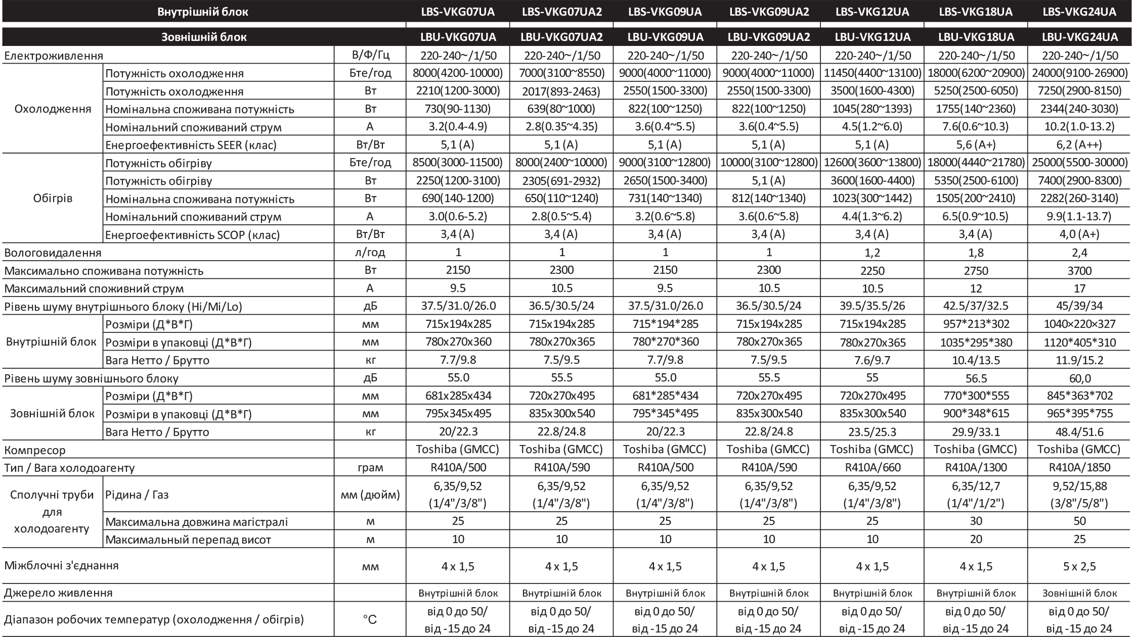 Технические характеристики: Кондиционер Leberg (Леберг) LBS-VKG24UA/LBU-VKG24UA