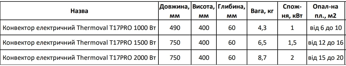 Технические характеристики: Конвектор электрический Thermoval (Термовал) T17PRO 2000 Вт.