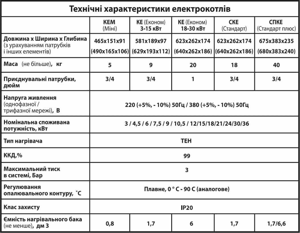 Котлы имеют три ступени нагрева, а подключение возможно в электрическую сеть 220 В или 380 В. Котлы «Стандарт» оснащены двухступенчатой системой защиты, которая предохраняет устройство от перегрева, датчиком давления, отключающим питание при отсутствии давления в системе, а также предохранительным клапаном, сбрасывающим давление в системе выше максимально допустимого в 3 атм.